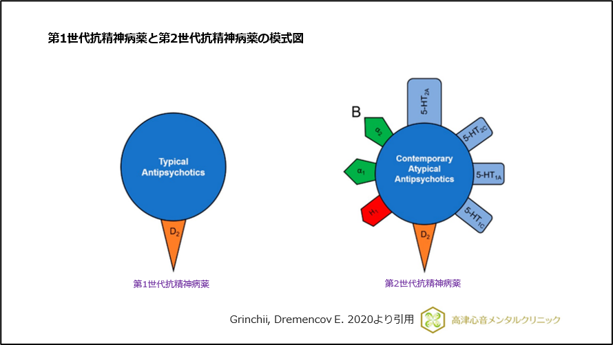 リスペリドン以降に複数のドパミンD2・セロトニン5-HT2A受容体阻害作用をもつ薬剤が開発され、それまで使用されていたクロルプロマジン、ハロペリドール等と区別して第2世代抗精神病薬と呼ばれるようになりました。
