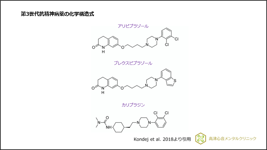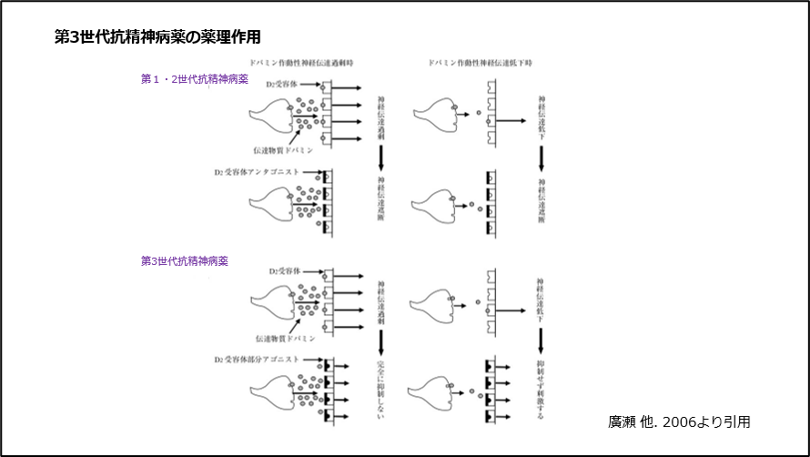 ドパミンシグナル伝達を遮断せず、適度に調整することで、幻覚妄想や気分の浮き沈みを改善する作用を有する抗精神病薬を、第3世代抗精神病薬と分類しています。