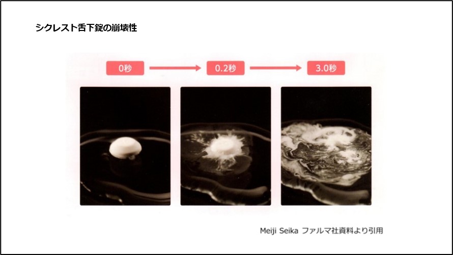 アセナピンに採用されているザイディス錠は口腔内崩壊錠(OD錠)の中でも速崩性であり、約3秒で口腔内で溶解します。(一般のOD錠は10~30秒です。)(図7)