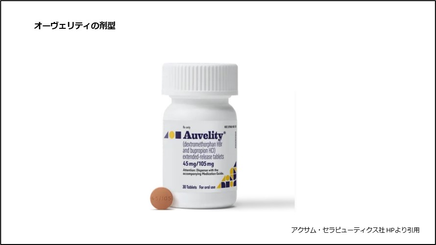 日本で使用されている咳止め薬のデキストロメトルファン(医薬品名:メジコン)と日本未承認薬の抗うつ薬ブプロピオンの2剤からなる合剤です(図2)。