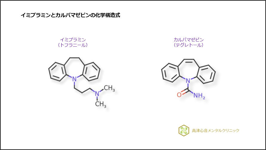 そのため、三環系抗うつ薬のイミプラミン(トフラニール)とカルバマゼピンは似た化学構造式となっています(図1)。