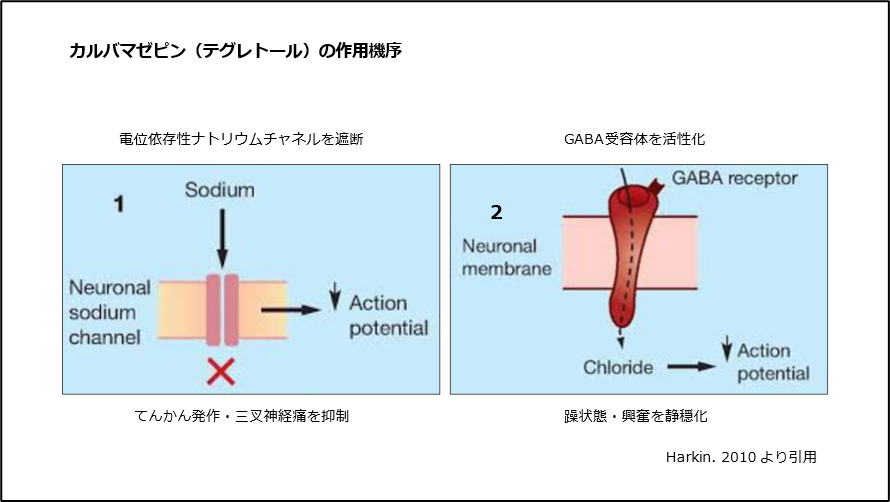 カルバマゼピンは、主として神経細胞の電位依存性ナトリウムチャネルを遮断することにより神経の興奮を抑制し、てんかん発作・三叉神経痛を改善するとされています8)、9)。