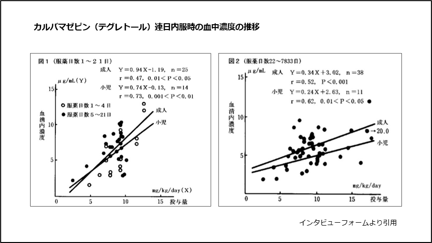 三叉神経痛の治療では、血中濃度5.7~10.1μg/mLが至適濃度であることが報告されています13)、14)。