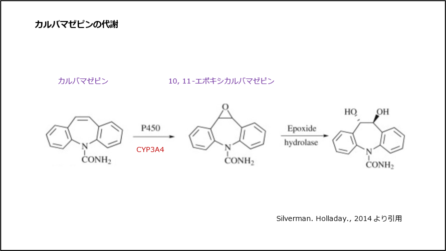 カルバマゼピンの約10~50%は、CYP3A4により活性代謝物(薬としての効果を発揮します)の10, 11-エポキシカルバマゼピンに代謝されます15)、(図6)。