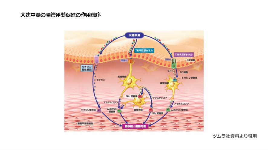大建中湯はTRPV1(カチオンチャネルVサブファミリー1)、ムスカリン受容体、セロトニン5-HT3受容体・5-HT4受容体等を介して、腸管運動を促進するとされています3)、4)、(図2)。