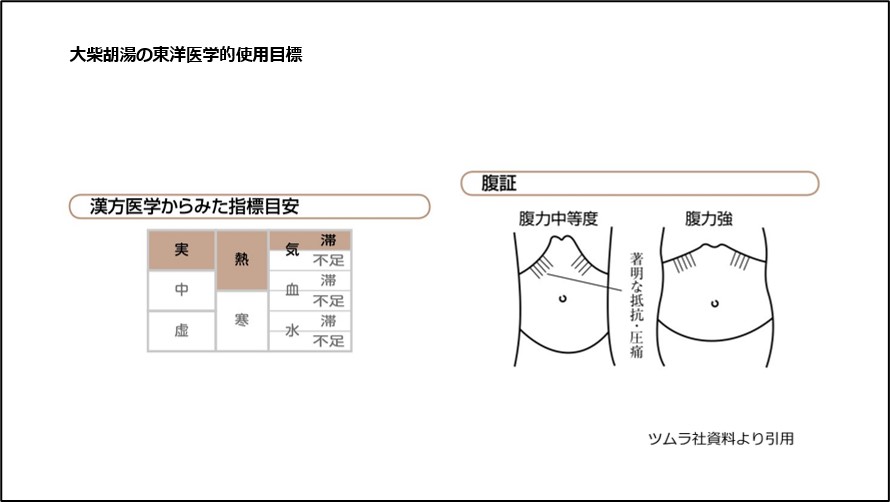 使用目標(証)は、体格・体力ともに充実した人で、胸脇苦満が強く、便秘する場合に用います。