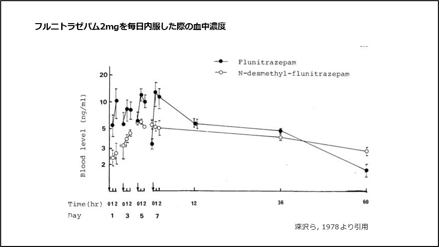 フルニトラゼパム2mgを毎日内服すると、3日目から5日目で一定の濃度に達し、最高血中濃度は1日1回内服時の約1.3倍となります2)、(図7)。