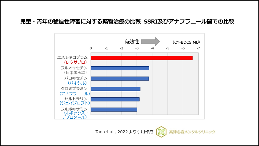 2) Ivarsson T, et al. : The place of and evidence for serotonin reuptake inhibitors (SRIs) for obsessive compulsive disorder (OCD) in children and adolescents: Views based on a systematic review and meta-analysis. Psychiatry Res, 227 : 93-103, 2015.