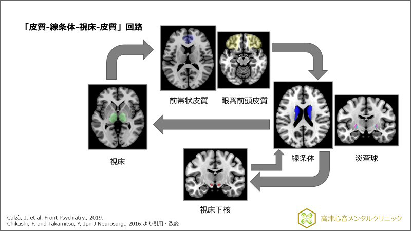 画像研究では脳の部位における「皮質-線条体-視床-皮質」という回路の異常が示されています(図2)。