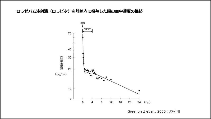 ロラゼパム注射液(ロラピタ)を静脈内投与した際は、血液中の濃度は約30分で最高濃度に達し、約14時間で半減します7)、(図6)