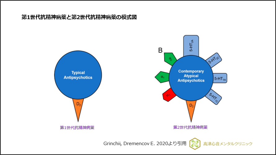 初期に開発された、ドパミン受容体に作用する定型抗精神病薬(第1世代抗精神病薬)と、その後に開発された、セロトニン受容体とドパミン受容体の両方に作用する非定型抗精神病薬(第2世代抗精神病薬)です(図1)。