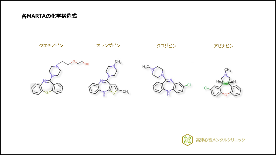 また、アセナピンでは有さないものの、他のMARTAでは、ムスカリンM1受容体阻害作用を有し、口渇や便秘の副作用が生じることがあります。