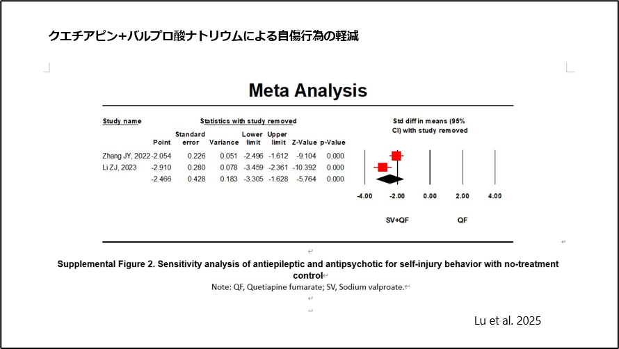 2025年1月、Luらは、クエチアピンとバルプロ酸ナトリウムの併用が、精神疾患当事者の自傷行為の軽減に有効であることを報告しています5)、(図8)。