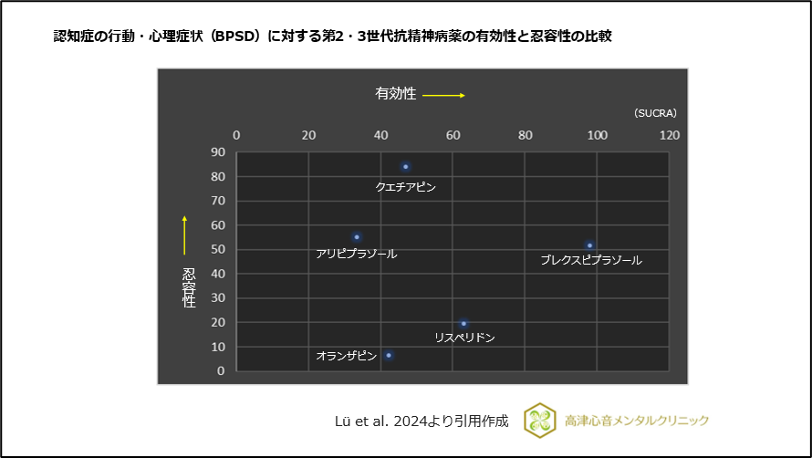 認知症の行動・心理症状(BPSD)に対する第2・3世代抗精神病薬の有効性と忍容性の比較では、忍容性の高い結果でした6)、(図9)。