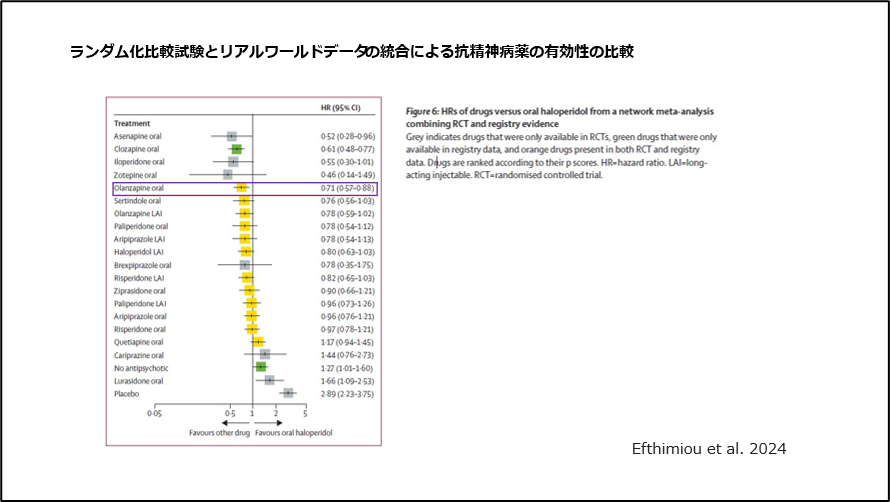 ランダム化比較試験とリアルワールドデータを組み合わせた結果では、オランザピンの有効性が最も優れている結果でした(図11)。
