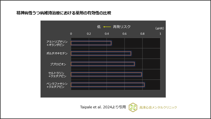 精神病性うつ病維持期における再発リスクの薬剤の有効性の比較において、三環系抗うつ薬のアミトリプチリンとの併用の有効性が高いことが報告されています17)、(図13)。