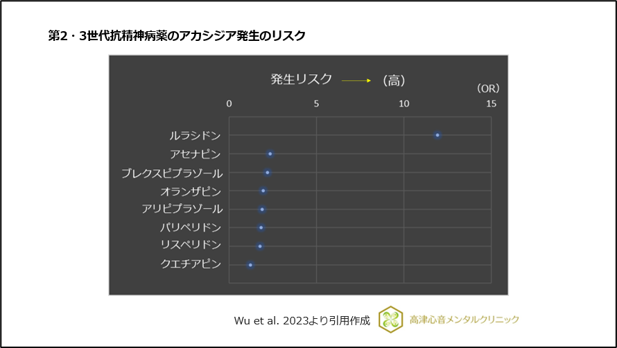 アカシジアのリスクはクエチアピンが低く、アセナピンがやや高いことが報告されています23)。