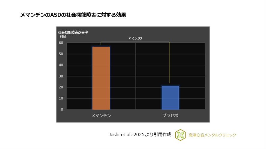2025年8月、Joshiらは、メマンチンのASDの社会機能障害に対する効果を検証するため、ASDの若年者をメマンチンとプラセボの投与群にわけ、二重盲検ランダム化比較試験を行いました。