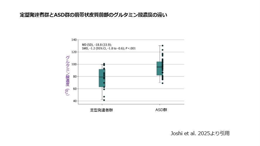 また、ASD群では、健常者より脳の前帯状皮質前部という部位のグルタミン酸濃度が高いことがわかりました(図2)。