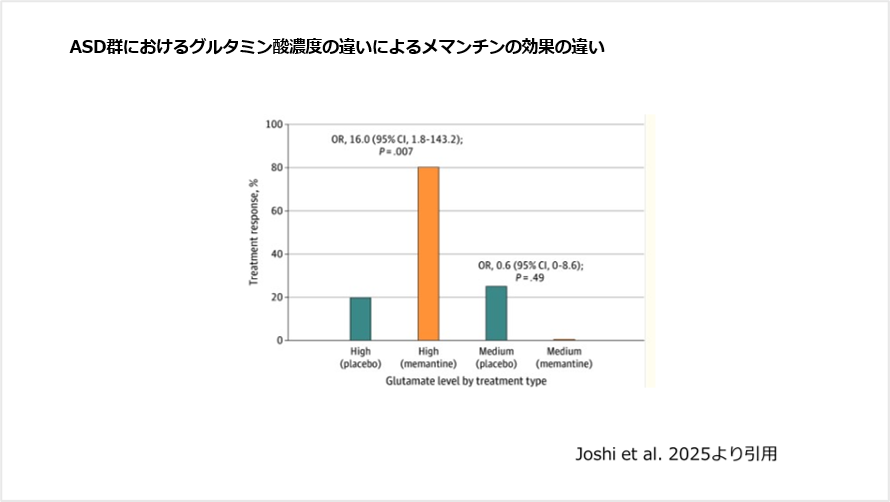 ASD群では、よりグルタミン酸濃度の高い群が、特にメマンチンで改善が得られる結果でした(図3)。