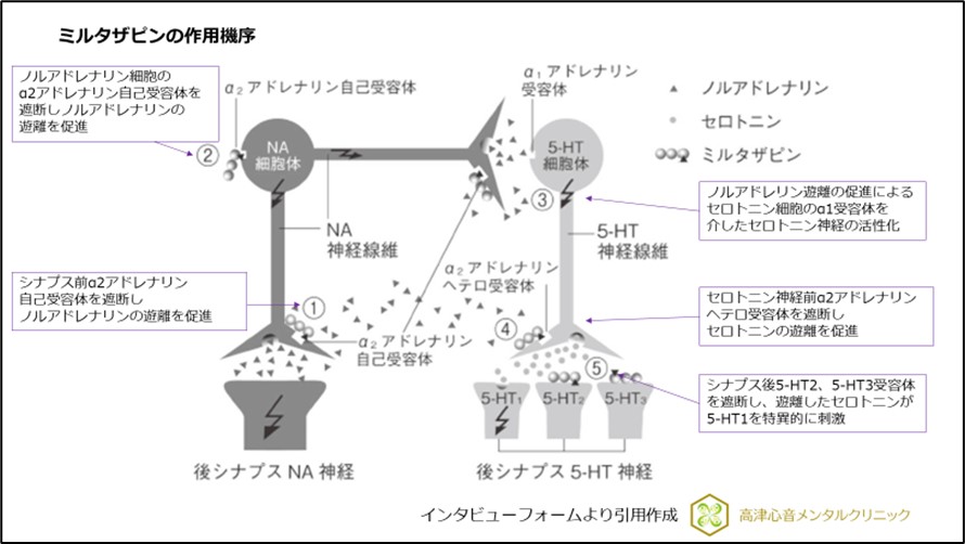 また、ヒスタミンH1受容体を介した眠気の副作用はあるも、セロトニン5-HT2A受容体阻害作用を介した深い眠りをもたらす作用を有しており、不眠が強いうつ病では有効性をもたらします5)。
