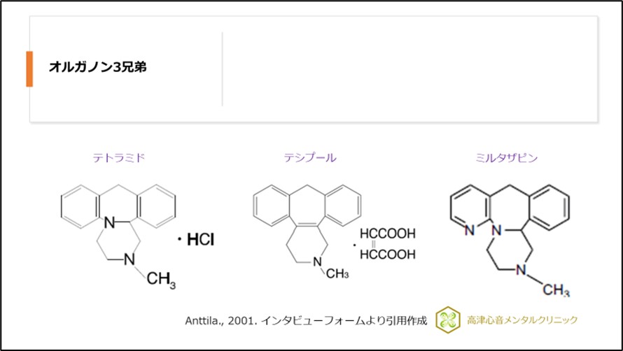 この開発経緯からテトラミド、テシプール、ミルタザピン(リフレックス・レメロン)はオルガノン3兄弟と呼ばれています1)、(図2)。