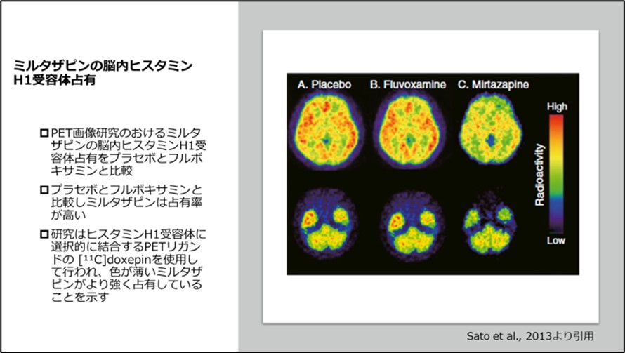 • 2) Sato H, et al. : Histamine H₁ receptor occupancy by the new-generation antidepressants fluvoxamine and mirtazapine: a positron emission tomography study in healthy volunteers. Psychopharmacology (Berl), 230 : 227-34, 2013.