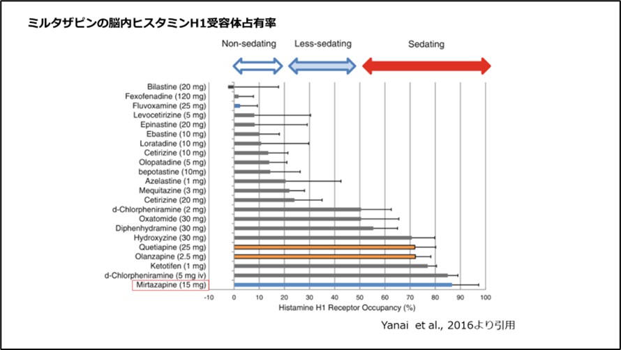 ミルタザピンは脳内ヒスタミンH1受容体阻害が強く、占有率が高いため抗うつ薬の中でも眠気が強く発現します2)、(図7)。