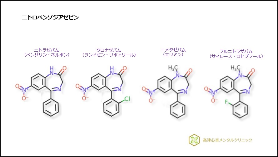 側鎖第7位にニトロ基を有するベンゾジアゼピンはニトロベンゾジアゼピンと呼ばれ、いずれも催眠作用と抗けいれん作用が強い特徴があります。