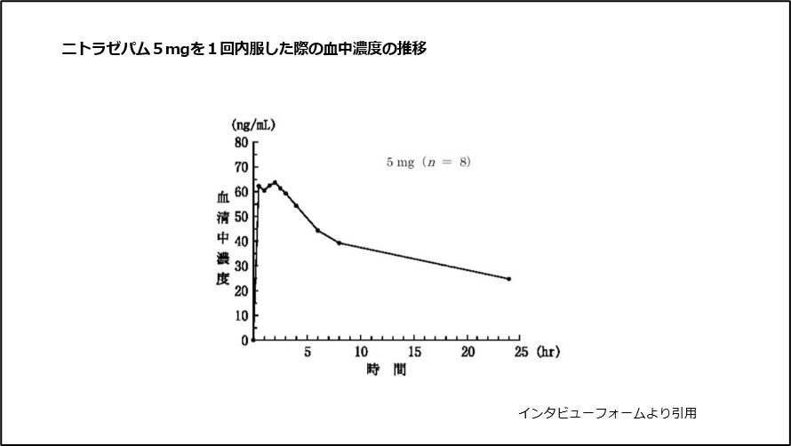 ニトラゼパム5mgを空腹時に1回内服した際は、血液中の濃度は約1.6時間後に最高濃度に達し、約27時間後に半減します(図4)。