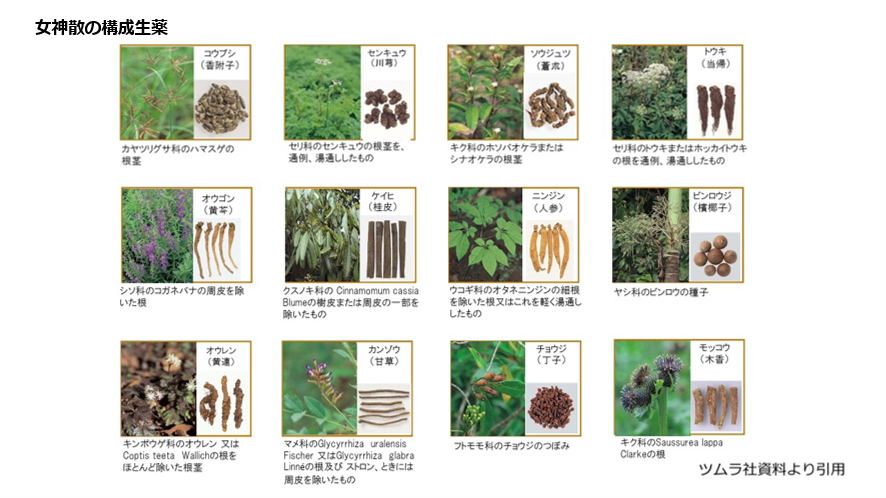 その後、幕末の漢方医、浅田宗伯により女性の血の道症にも効果があることから、女神散と名付けられました