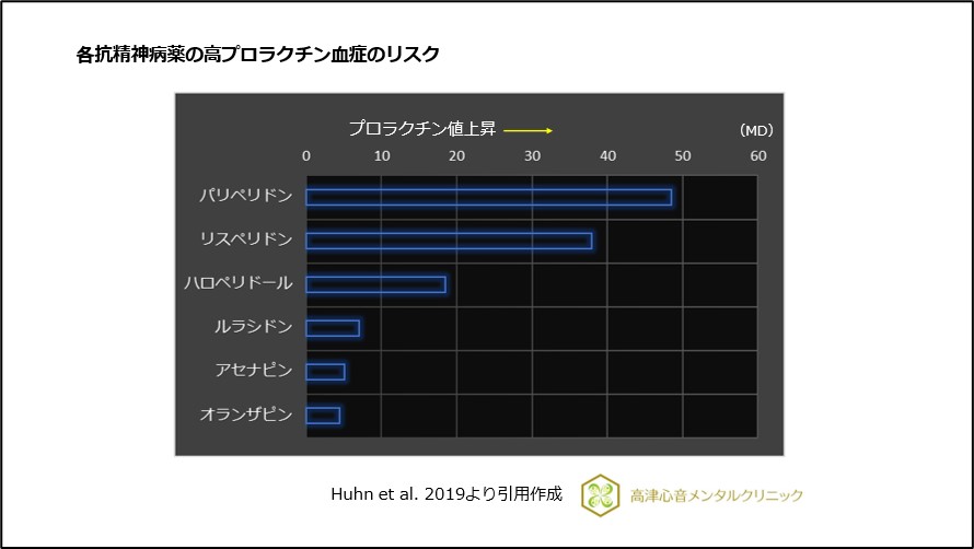 2019年にHuhnらが、発表した抗精神病薬の有効性と忍容性の比較では、抗精神病薬による高プロラクチン血症のリスクは以下の順で高い結果でした1)、(図1)。