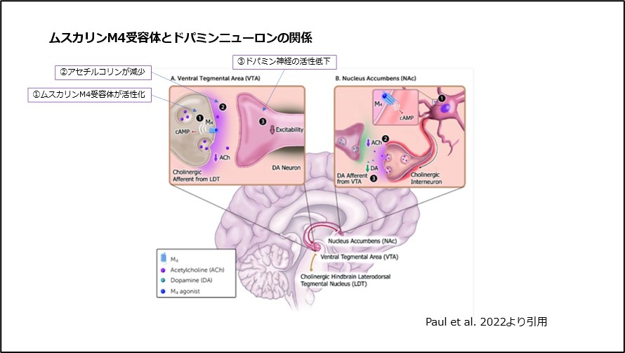 近年、ドパミンだけでなくムスカリン受容体との関連もわかってきています。