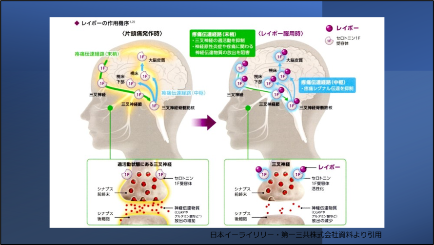 ラスミジタン(レイボー)はセロトニン5HT1F受容体に作用し、三叉神経から痛みのもととなる神経伝達物質の放出を抑制するともに、脳内で痛みの伝達を抑えることにより片頭痛の痛み改善します7)、(図1)。