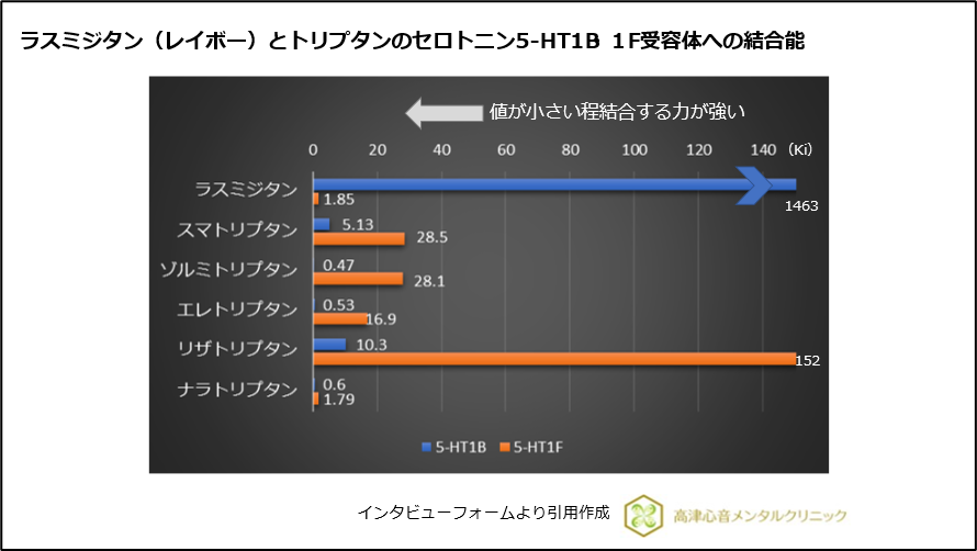 トリプタンとレイボーの違いをより端的にいうと、トリプタンは5-HT1B、5HT1Fに作用する薬で、レイボーは5HT1Fにのみ作用する薬となります。