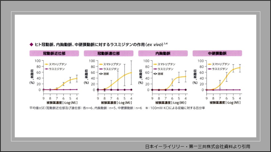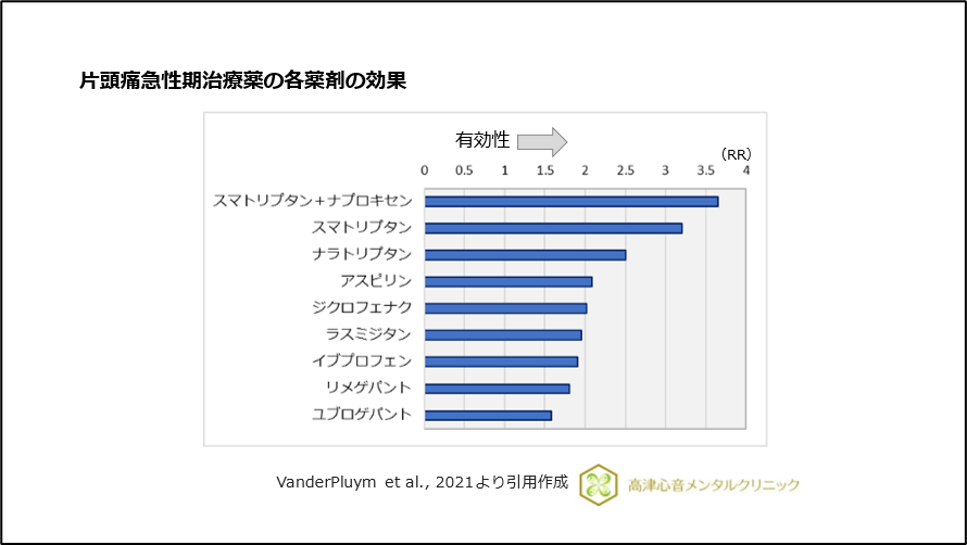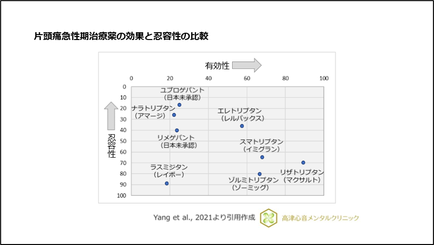 片頭痛急性期におけるトリプタン系製剤とラスミジタン(レイボー)、ゲパント系製剤(ユブロゲパント、リメゲパント)を比較した研究では、効果はトリプタン系製剤が優れていました。