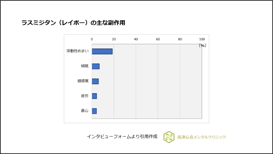 主な副作用は浮動性めまい(18.66%)、傾眠(6.85%)、錯感覚(5.97%)、疲労(4.35)、悪心(4.32%)でした(図6)。