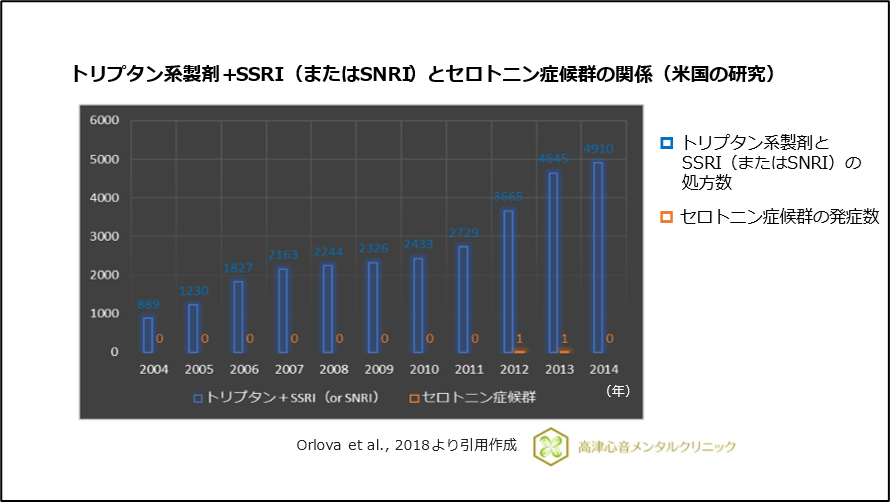 しかし、トリプタン系製剤とSSRI、SNRIの処方とセロトニン症候群の関係を調査した研究では相関性は乏しいことが報告されています 11)、(図7)。