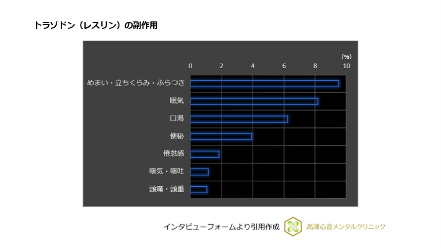 トラゾドンは低用量では、セロトニン再取り込み阻害作用の効果は弱まり、他にもともと有しているセロトニン5-HT2A受容体、ヒスタミンH1受容体、アドレナリンα1受容体阻害効果は維持されます。