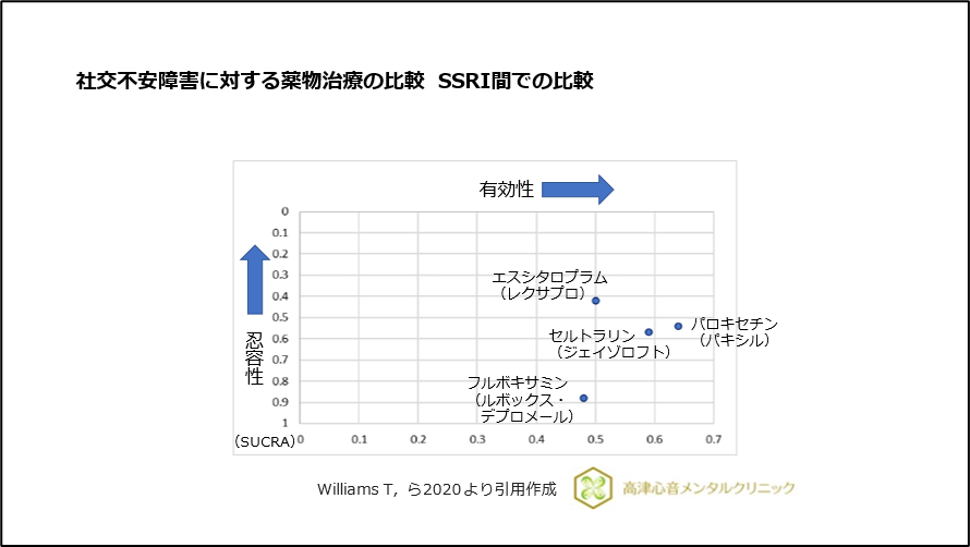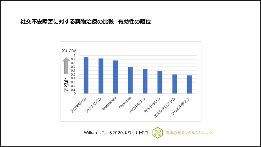 各薬剤を有効性のみで見た場合、ベンゾジアゼピンのブロマゼパム(レキソタン)、クロナゼパム(ランドセン・リボトリール)、Brofaromine(モノアミンオキシダーゼA;発売中止)、Phenelzine(モノアミン酸化酵素阻害薬;発売中止)、パロキセチン(パキシル)、セルトラリン(ジェイゾロフト)、エスシタロプラム(レクサプロ)、フルボキサミン(ルボックス・デプロメール)の結果でした。