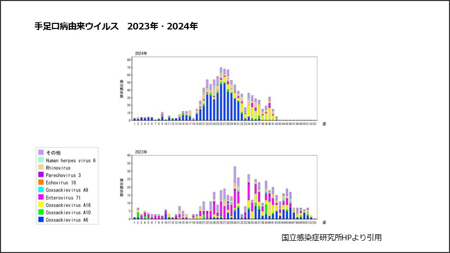 幸い2024年度の手足口病の原因ウイルスは、2023年と比較して、エンテロウイルス71の割合は少ないことが報告されています7)、(図4)。