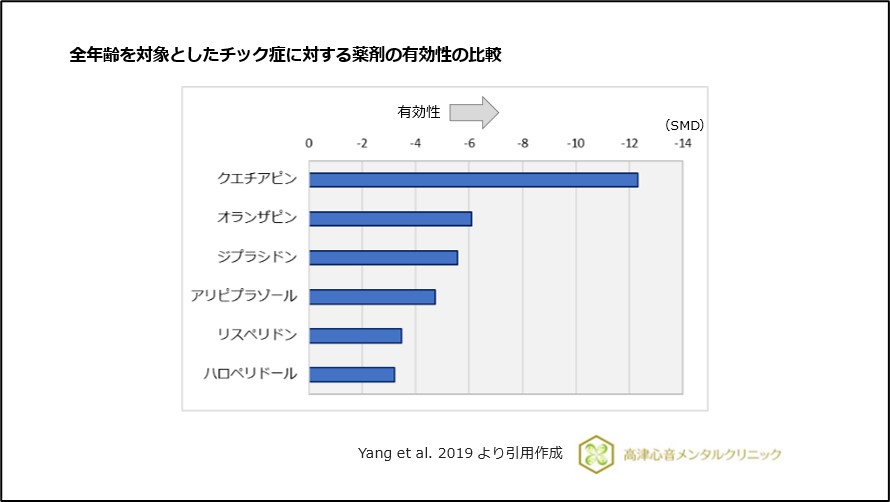 Yangらが2019年に報告した、全年齢を対象としたチック症の薬剤の有効性と安全性の比較では以下の順に有効性が示されました2)。