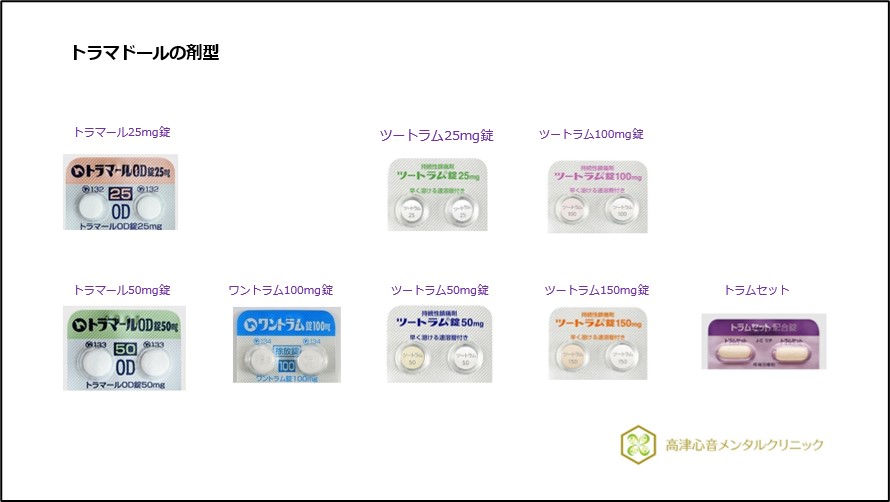 鎮痛薬のトラマドールは1日数回にわけて内服するトラマールと、1日1回内服のワントラム、1日2回内服のツートラム、アセトアミノフェンとの合剤のトラムセットがあります(図1)。