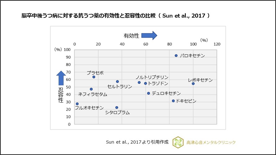 Sun Yらは2017年に脳卒中後うつ病に対する抗うつ薬の有効性と忍容性の比較の解析を報告しました。