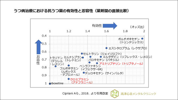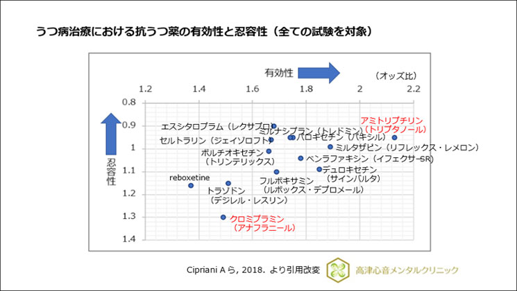 1)Cipriani A, et al. : Comparative efficacy and acceptability of 21 antidepressant drugs for the acute treatment of adults with major depressive disorder: a systematic review and network meta-analysis. Lancet, 391 : 1357-1366, 2018.