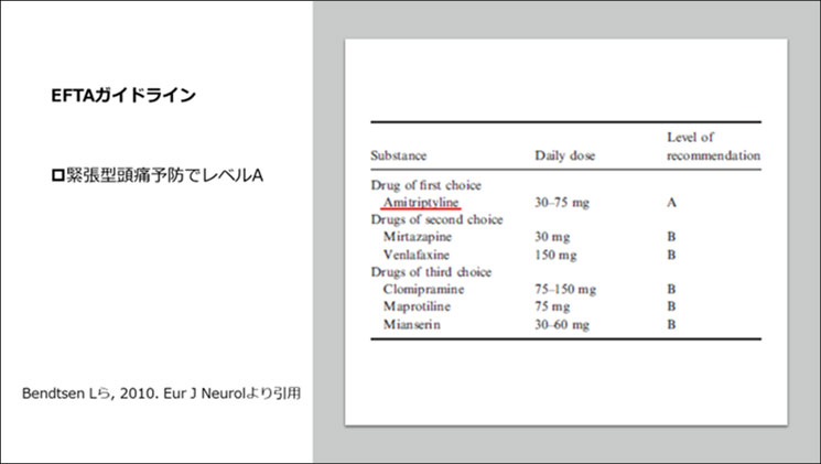 4)Bendtsen L, et al. : EFNS guideline on the treatment of tension-type headache – report of an EFNS task force. Eur J Neurol, 17 : 1318-25, 2010.