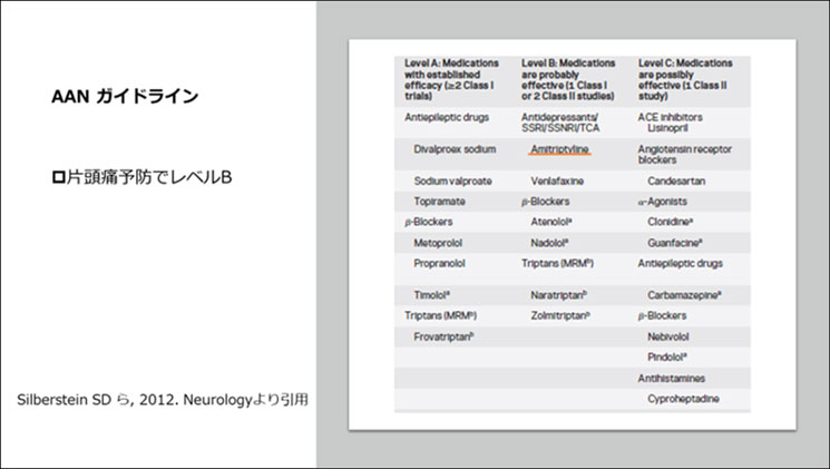 5)Silberstein SD, et al. : Evidence-based guideline update: pharmacologic treatment for episodic migraine prevention in adults: report of the Quality Standards Subcommittee of the American Academy of Neurology and the American Headache Society. Neurology, 78 : 1337-45, 2012.