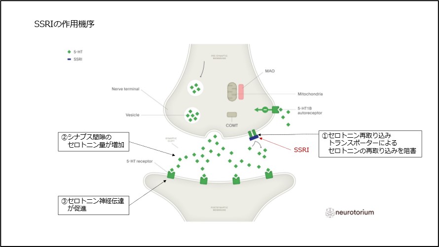 SSRIは、シナプス前ニューロンでセロトニン再取り込みトランスポーターを阻害することで、シナプス間隙のセロトニン量を増加させ、セロトニン神経伝達を促進させます(図1)。