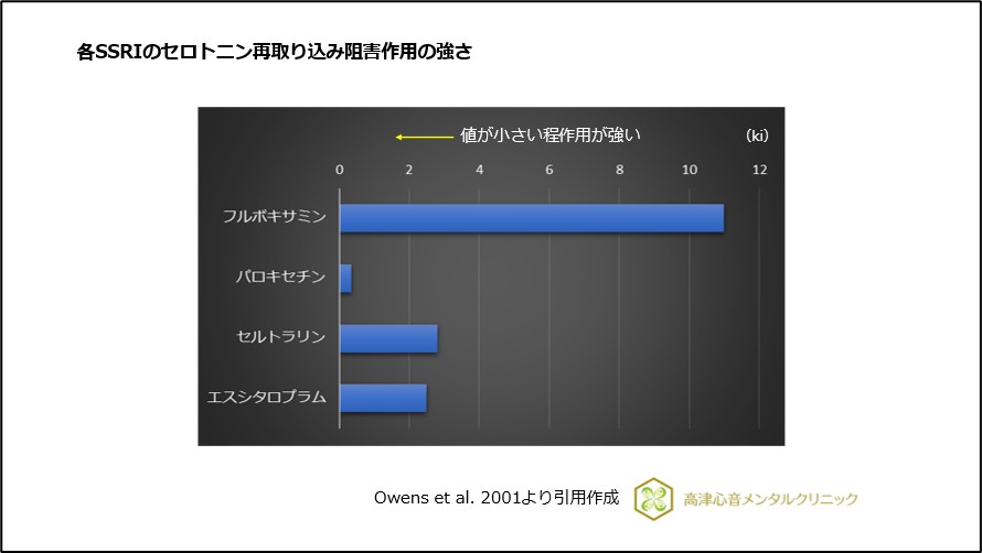 各SSRIのセロトニン再取り込み阻害作用の強さはパロキセチンが強く、フルボキサミンがマイルドであることがわかっています3)、(図2)。