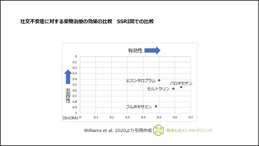 2020年にWilliams, T.らにより、社交不安障害に対する各薬剤の有効性と忍容性を比較した解析結果が報告されました14)。